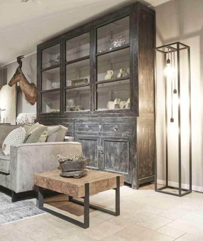 Meestal voeren in een industrieel interieur donkere kleuren de boventoon, maar je kan prima lichte en donkere kleuren met elkaar combineren. Bijvoorbeeld een donkere kast en tafel in combinatie met een lichte bank of fauteuil. En de huidige ‘fluweel’ trend geeft een mooi contrast en tegelijkertijd een zachte uitstraling.